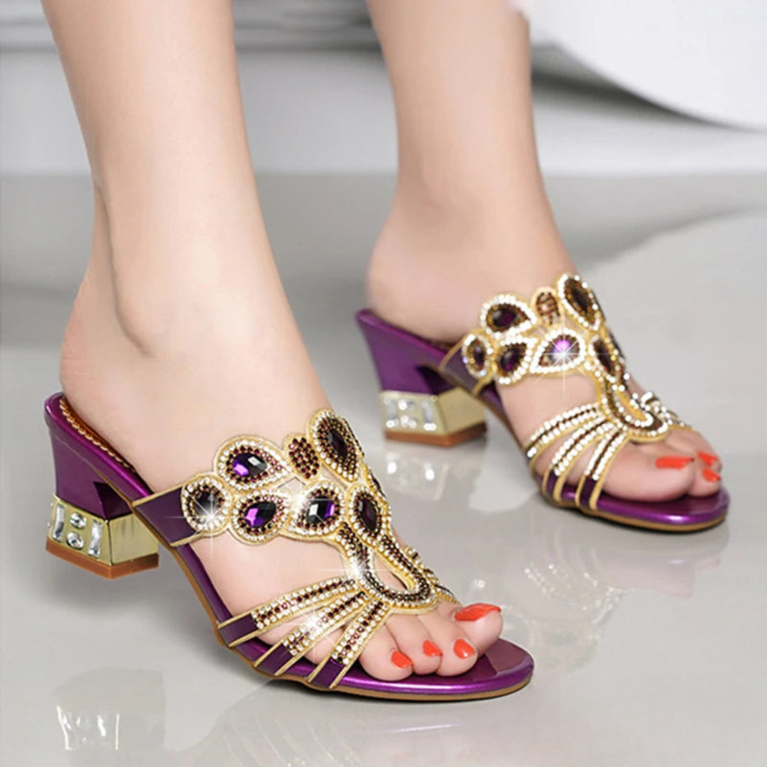 Step into summer with elegance and sparkle in these open-toe block heels. Featuring a thick heel and sparkling crystals, these sandals offer both comfort and style. Perfect for beach outings or evening events, they are designed to elevate any outfit and ensure you shine wherever you go.