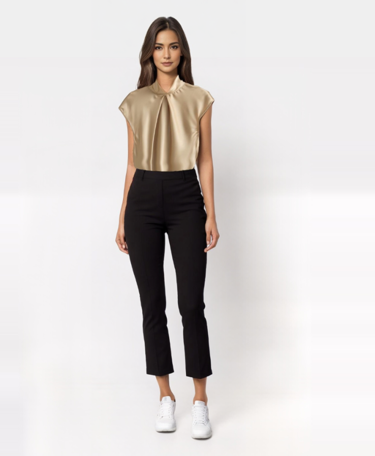 This sleeveless blouse is the perfect blend of style and simplicity. With its twisted high collar and sleek design, it transitions easily from day to night, keeping you looking polished and fashionable. Available in a variety of colors, it's a versatile addition to any wardrobe.