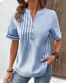 Elevate your wardrobe with this comfortable V-neck striped blouse. Its classic design offers a stylish yet relaxed fit, making it perfect for both casual days and more polished events. With its versatile look, this blouse pairs effortlessly with various outfits, ensuring you stay comfortable and fashionable all day long.