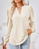 Elevate your look with this Jacquard V-neck Blouse. Featuring a solid color and stylish puff sleeves, this top combines casual comfort with elegant charm. Its long sleeves and relaxed fit make it perfect for both laid-back days and more polished looks, offering versatility for any event.