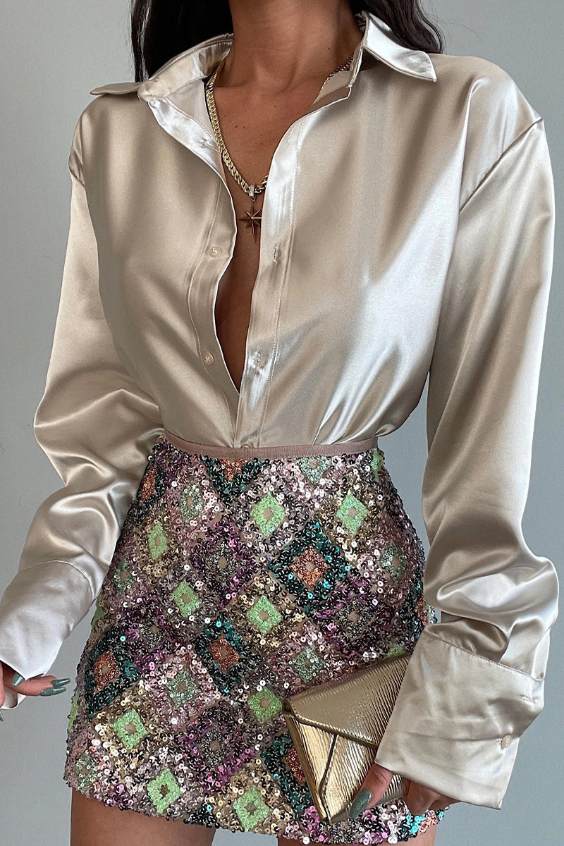What makes this shiny button-down long-sleeve shirt the perfect choice for you?