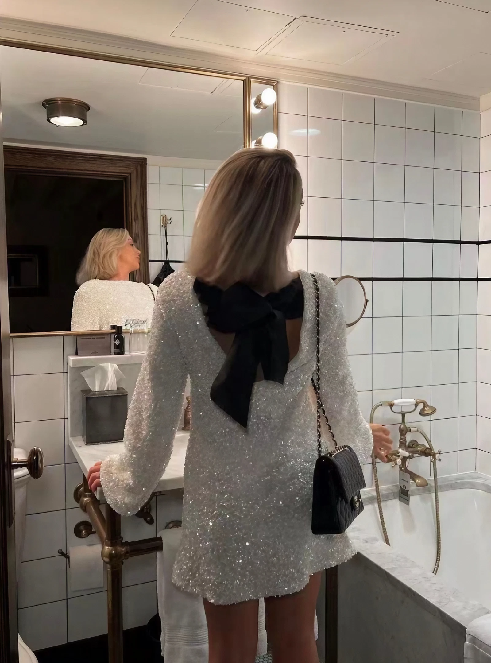 Add some sparkle to your wardrobe with this elegant sequin mini dress. Featuring a chic bow accent and a flattering fit, it’s perfect for any occasion. Whether you're attending a party or going to a special event, this dress combines comfort and style effortlessly.