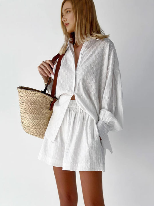 The stylish white shirt and shorts set for women offers a chic, effortless look perfect for summer days or casual outings. The crisp white shirt features a tailored fit with elegant details like rolled sleeves and a modern collar, while the matching shorts provide a comfortable and flattering silhouette. This set seamlessly blends sophistication with relaxed, easy-going style.
