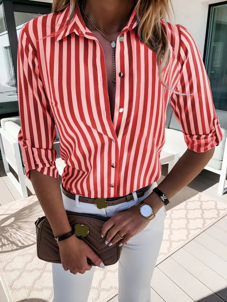 This striped button-down shirt combines classic design with modern versatility. The vertical stripes create a polished look, while the roll-tab sleeves allow for easy styling. Whether for office wear or casual outings, this shirt adds effortless elegance and comfort to any outfit, making it perfect for everyday use.