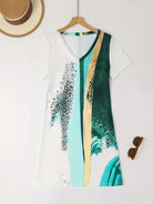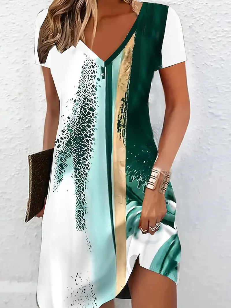 Prepare for summer with our chic V-neck mini dress! Adorned with a playful abstract print, this dress is ideal for beach outings and outdoor activities. Its lightweight construction ensures you stay cool while looking fabulous in the sunshine with friends and family!